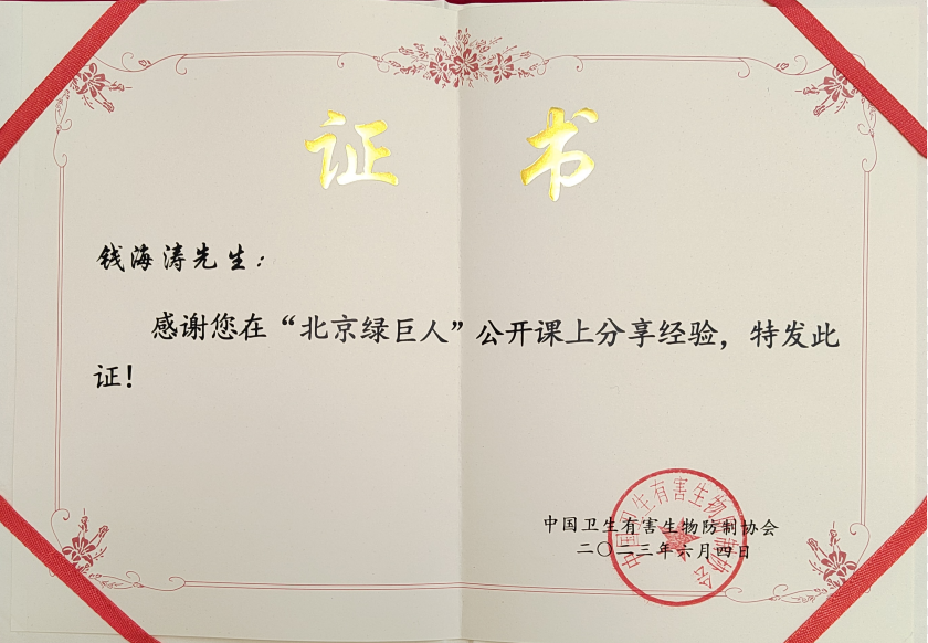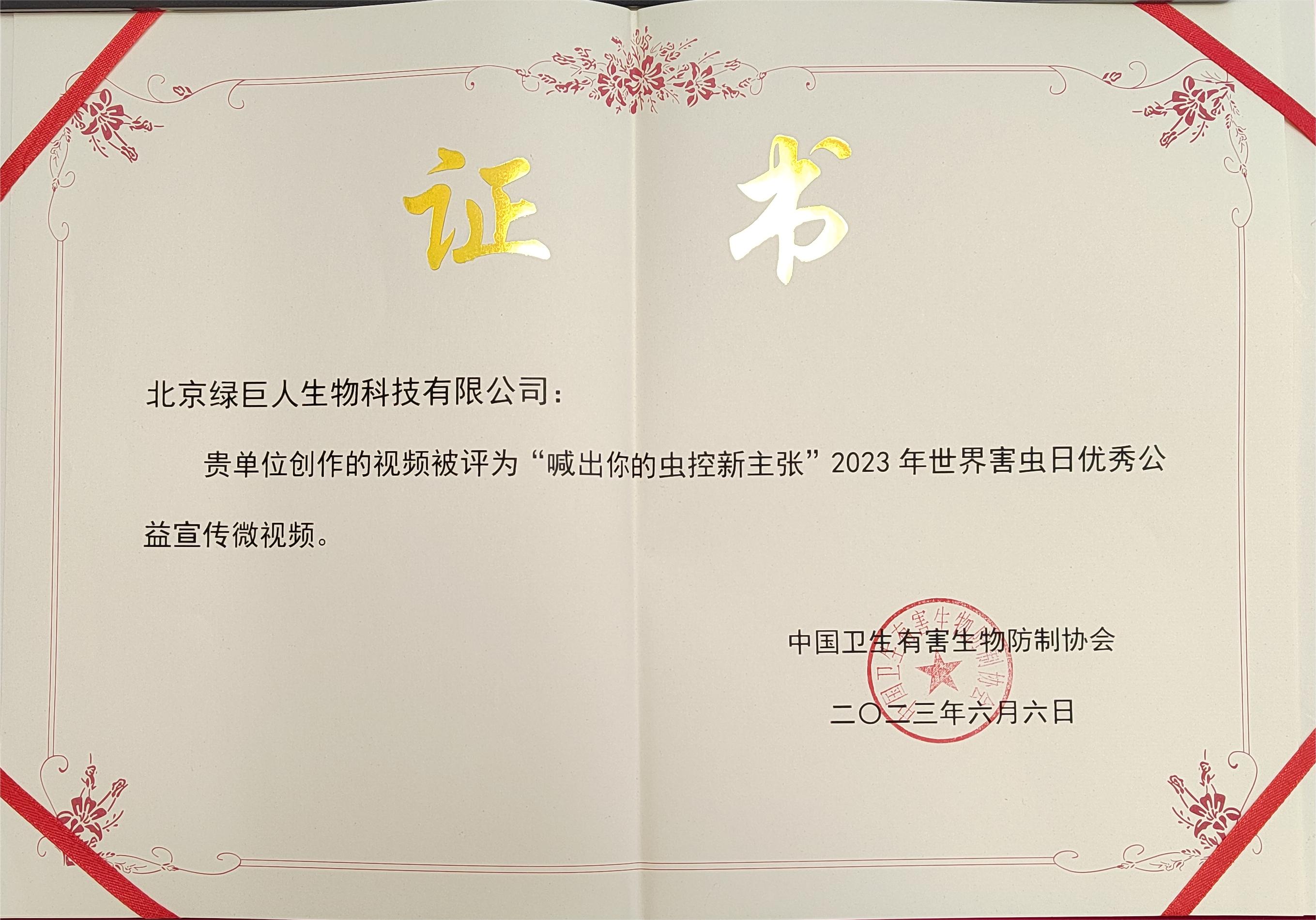 “北京綠巨人”在2023年6月6日世界害蟲日全國公益主場活動(dòng)中,榮獲“2023年世界害蟲日,優(yōu)秀公益宣傳微視頻”稱號(hào)。